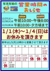 さて今回は、年末年始の営業時間の予定と、