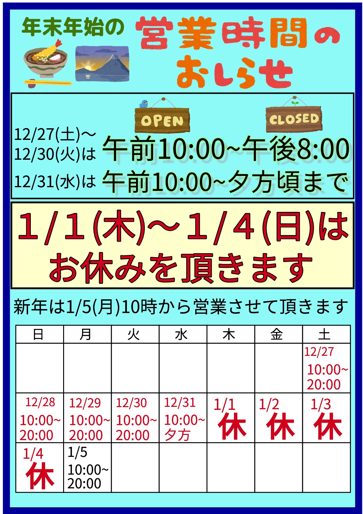 年末年始営業時間のお知らせ