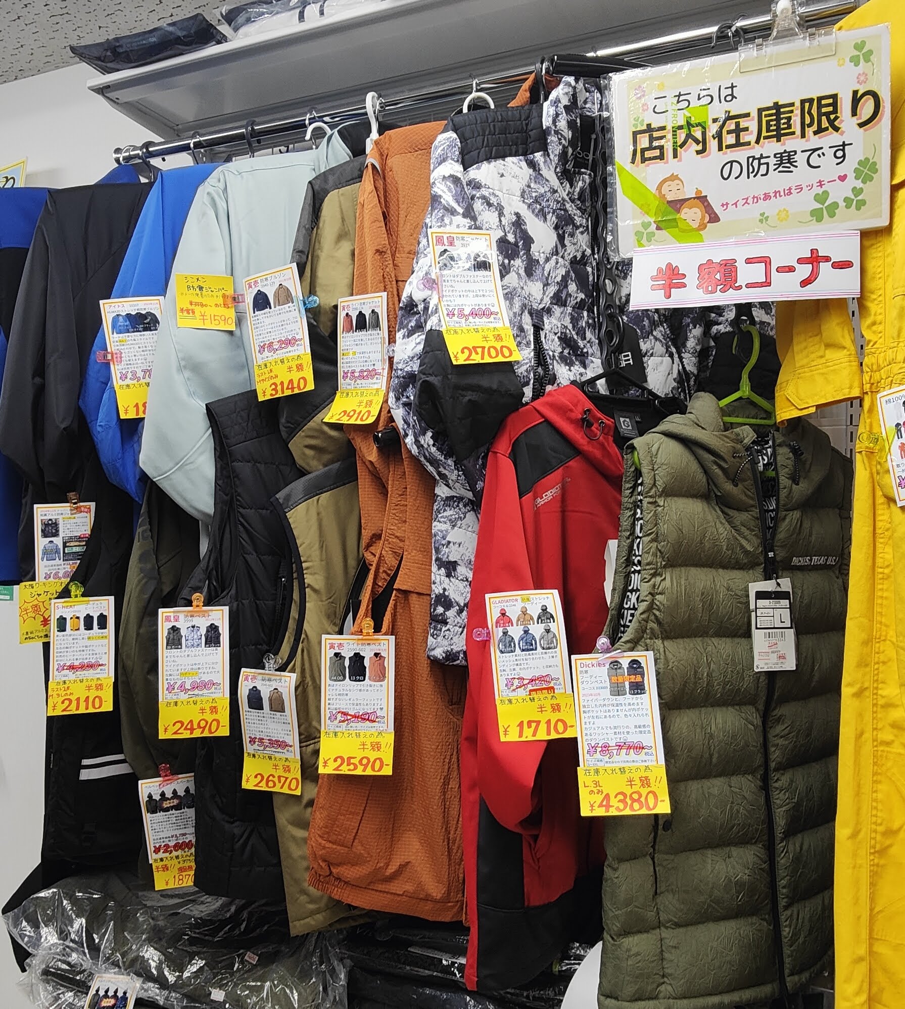 他にもポロやインナーや皮手や合羽等、店内色んな所にお買い得商品がありますので、